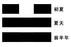 表示夏天的两个卦是兑卦与乾卦,都是在古夏字即两个阳爻上面分别画上一阴与一阳而创造出来的。因为对于夏天而言,太阳继续由南向北移动,气温一天天继续升高,白昼一天天加长,后一段更有甚于前一段,所以在表示夏的符号上先画上个阴爻表示初夏,另画一个阳爻表示长夏。这两个符号应该起什么名字呢?
