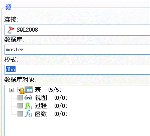 10、那么现在在源连接中选择SQL2008,下面选择数据库,模式选择dbo,选择需要的表,视图,函数......
